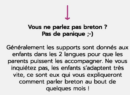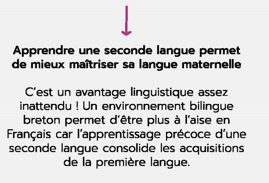 La langue bretonne relie un enfant à l’histoire, à la culture et aux valeurs du territoire où il grandit. Présente au quotidien, la langue bretonne s’affiche partout : dans les noms de lieux, dans les expressions de langage, à la télé, sur internet, dans les campagnes de publicité, etc. Aujourd’hui, apprendre le breton, c’est aussi trouver un intérêt pour mieux comprendre l’histoire de sa Région, de son territoire et se sensibiliser à la culture propre à notre environnement.