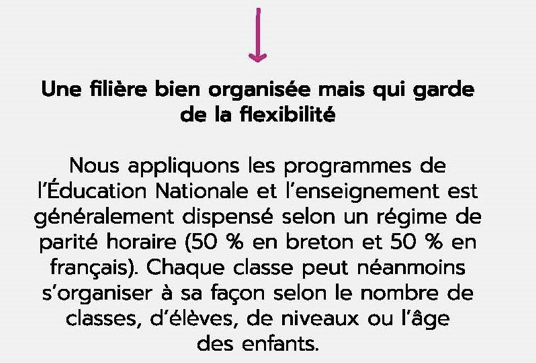 Degemer matE-barzh ma c’hlas e heuliomp ar memes danvezioù ha programmoù eget ar c’hlasoù unyezhek. Koulskoude e komzomp brezhoneg er c’hlas ! An hanter eus an deskiñ a zo graet gant hor yezh, hag an hanter-all e gallek. An divyezhegezh a zo ur gwir binvidigezh evit ar vugale. Digeriñ a ra o spered, kas a ra d’al liesyezhegezh oc’h anavezout o gwrizioù ha re an dud all.