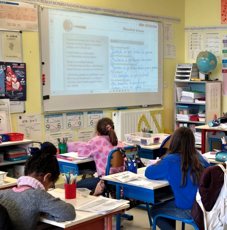 Dans notre classe bilingue, nous suivons les mêmes programmes que dans les classes monolingues, si ce n’est que nous parlons breton en classe ! La moitié des apprentissages se fait donc dans cette langue, à parité horaire avec le français. Le bilinguisme est une richesse pour les élèves qui stimule l’éveil, prépare au multilinguisme tout en découvrant ses racines et en s’ouvrant à celles des autres.